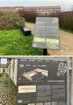 Sur le chemin qui longe la Charente, de la porte du Soleil au pont transbordeur, on aperçoit le magasin général, un bâtiment en U construit fin XVIIe siècle, qui faisait partie des premières constructions de l’Arsenal. La belle façade tournée vers le fleuve a disparu et a laissé la place à une vaste cour aménagée en espace vert. Depuis le début du mois de novembre, c’est dans cette cour que des panneaux descriptifs en français et en anglais peu visibles avec photos et plans ont été disposés pour rappeler l’existence du bagne qui se trouvait précisément derrière.